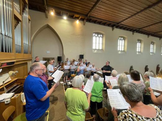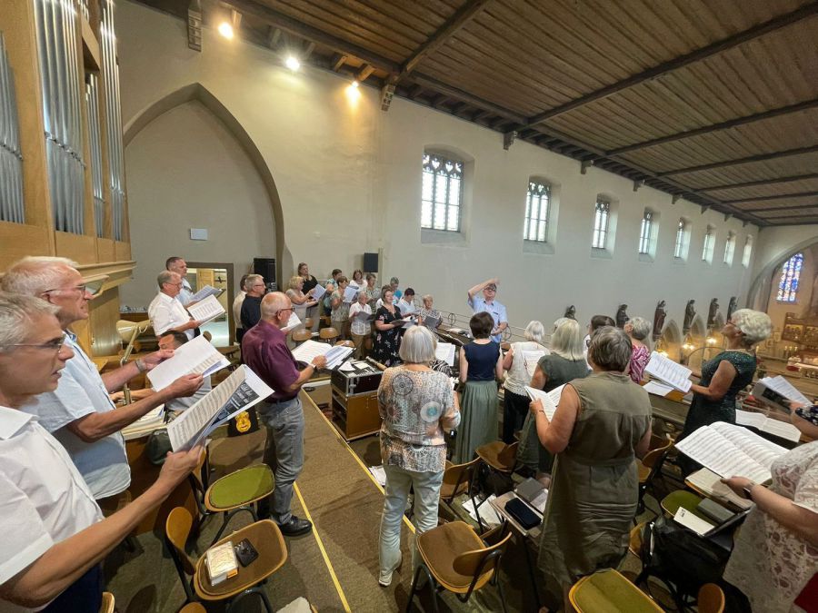 Auch am diesjährigen Pfingstfest, dem Geburtstag der Katholischen Kirche, gestaltete der Kirchenchor mit Dirigent Markus Zepp den Festgottesdienst musikalisch mit. Hierzu hatten sich die Sängerinnen und Sänger aus dem Stammchor und vom Vocalitas bei sommerlichen Temperaturen zum Einsingen eingefunden. Unter der Leitung von Markus Zepp und Alexander Burghardt an der Orgel, brachte der Chor neue Pfingstlieder zu Gehör.