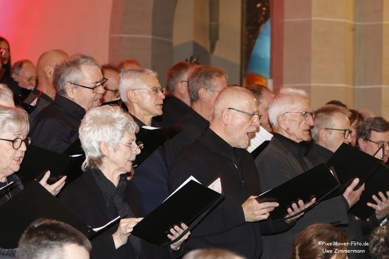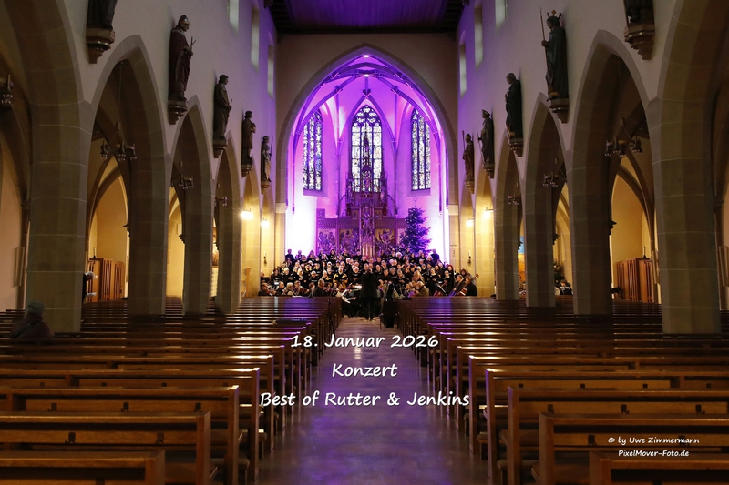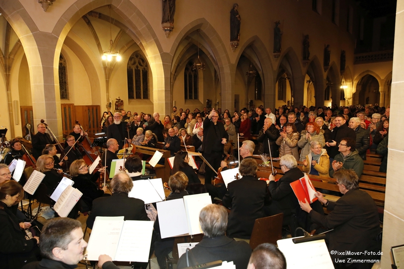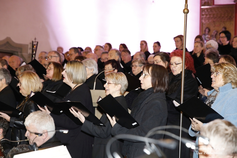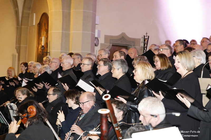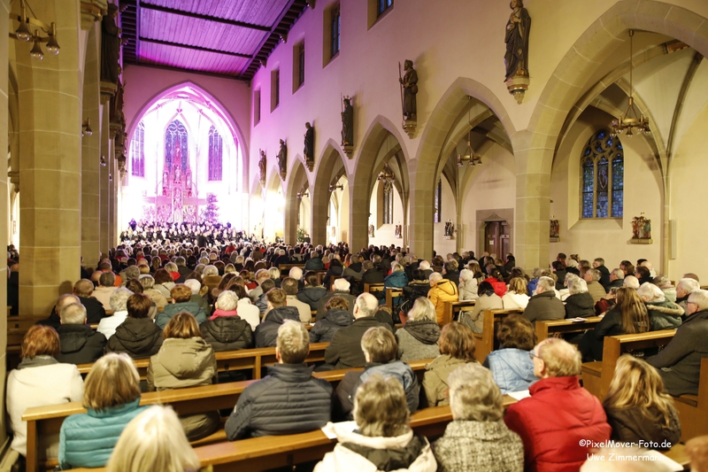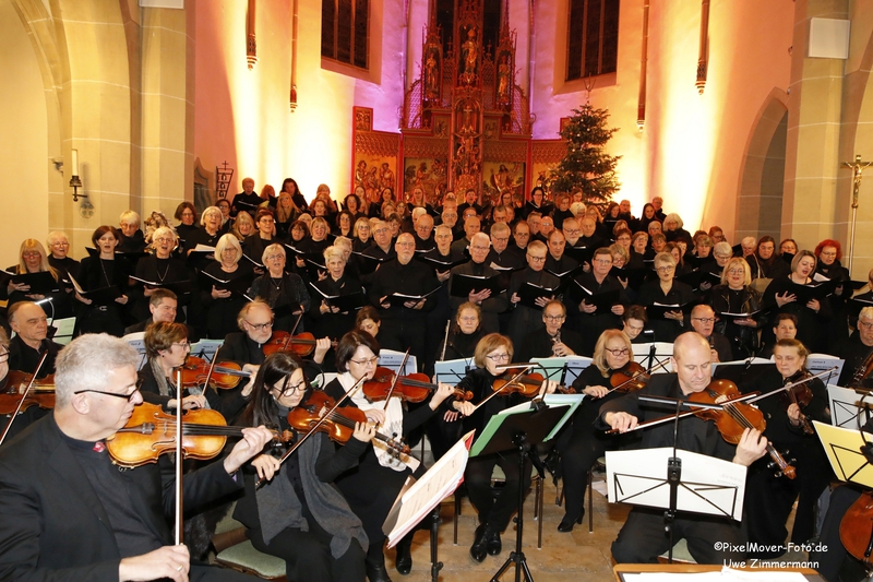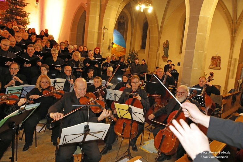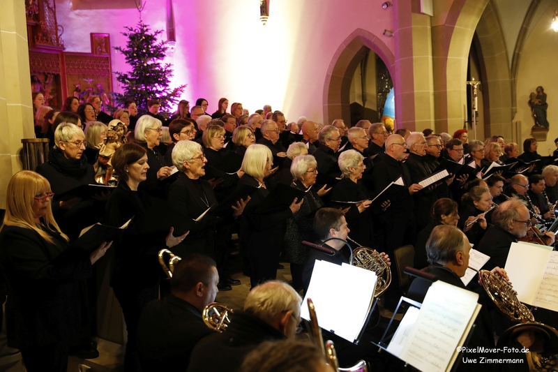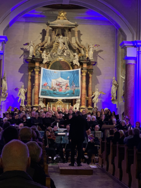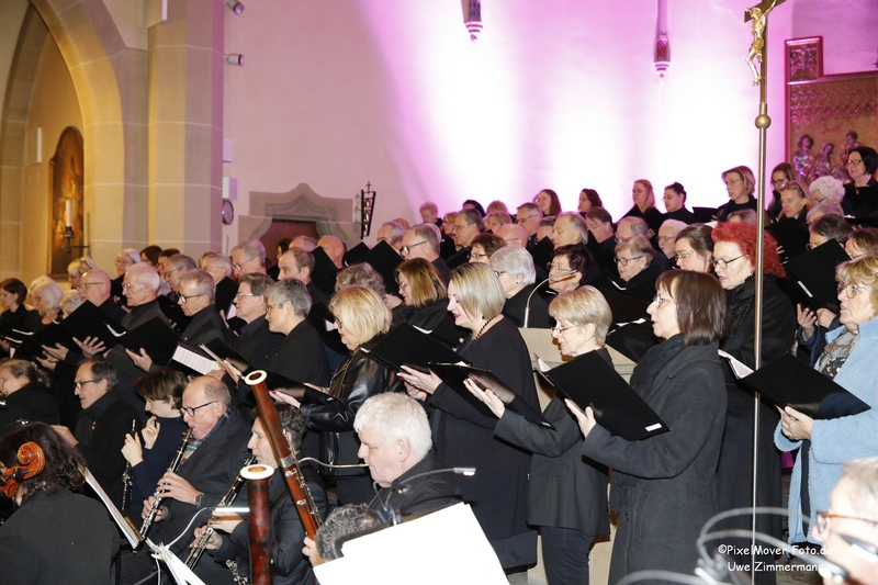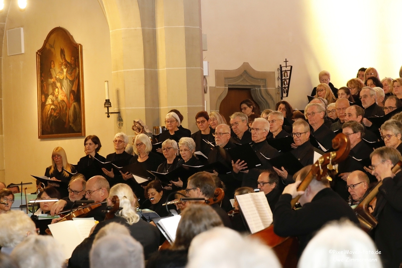 In der vollbesetzten Kirche in Hambrücken boten die Sängerinnen und Sänger ein stilistisch abwechslungsreiches Programm der Superlative, das seinesgleichen sucht. Allein die beiden namensgebenden Komponisten John Rutter und Karl Jenkins versprachen allein schon einen Abend voller Emotionen und eingehender Melodien. Der aus gut 100 Sängerinnen und Sängern bestehende Gesamtchor füllte den Altarraum der Pfarrkirche St. Remigius komplett aus. Hinzu kamen die knapp 40berufenen Musiker der Kurpfalzphilharmonie Heidelberg und eine feierliche und stimmungsvolle Illumination der Pfarrkirche St. Remigius Hambrücken, wodurch dieser Konzertabend zu einem Klang- und Augenschmaus für die zahlreichen Zuhörer wurde.