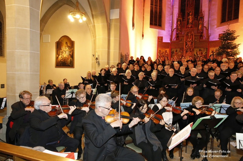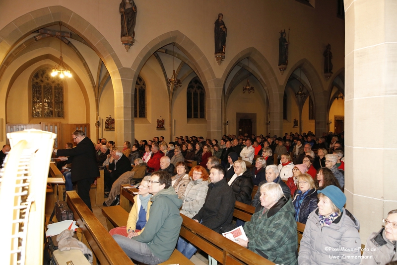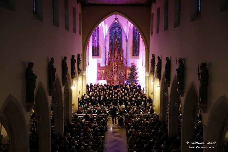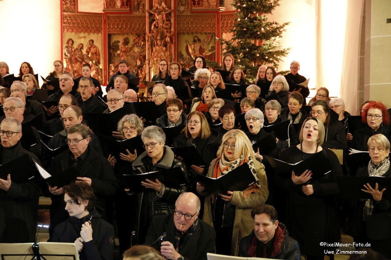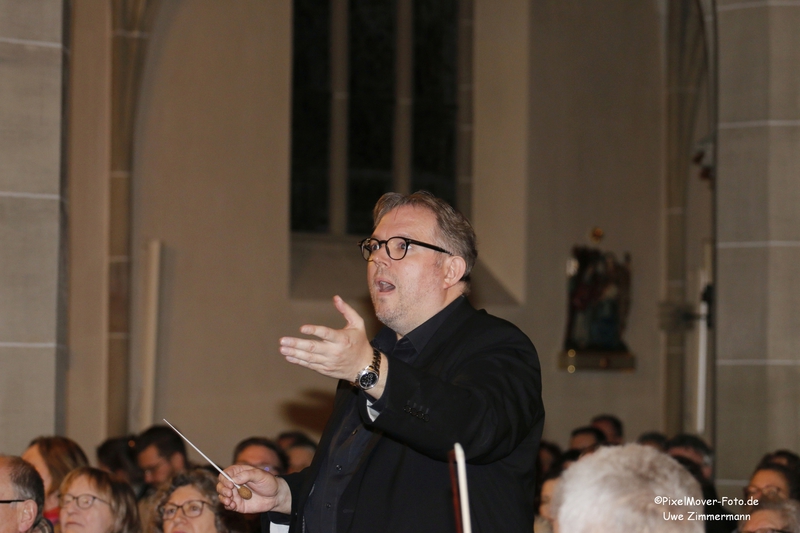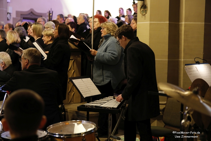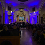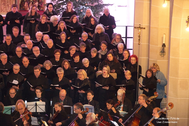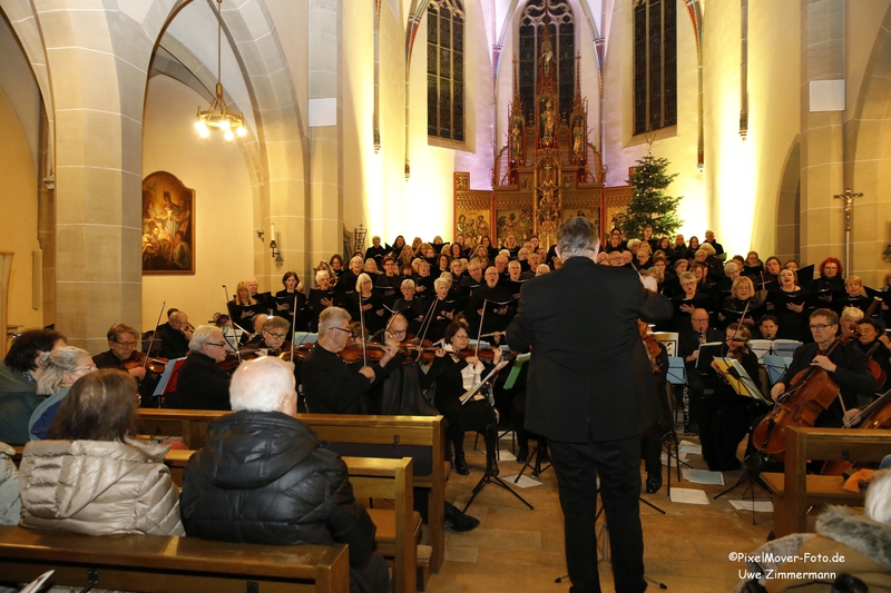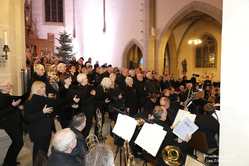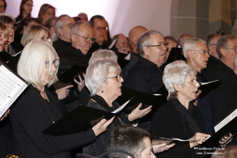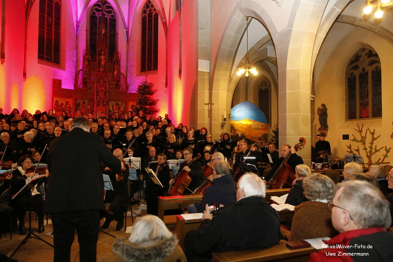 In der vollbesetzten Kirche in Hambrücken boten die Sängerinnen und Sänger ein stilistisch abwechslungsreiches Programm der Superlative, das seinesgleichen sucht. Allein die beiden namensgebenden Komponisten John Rutter und Karl Jenkins versprachen allein schon einen Abend voller Emotionen und eingehender Melodien. Der aus gut 100 Sängerinnen und Sängern bestehende Gesamtchor füllte den Altarraum der Pfarrkirche St. Remigius komplett aus. Hinzu kamen die knapp 40berufenen Musiker der Kurpfalzphilharmonie Heidelberg und eine feierliche und stimmungsvolle Illumination der Pfarrkirche St. Remigius Hambrücken, wodurch dieser Konzertabend zu einem Klang- und Augenschmaus für die zahlreichen Zuhörer wurde.