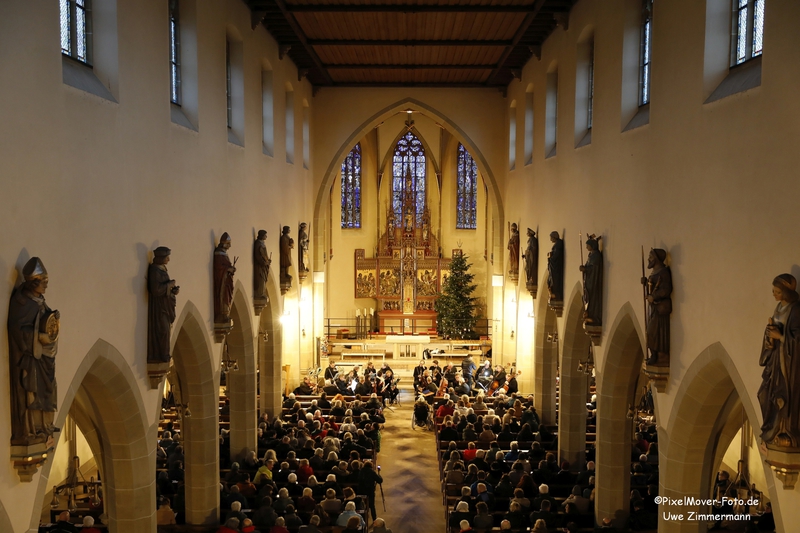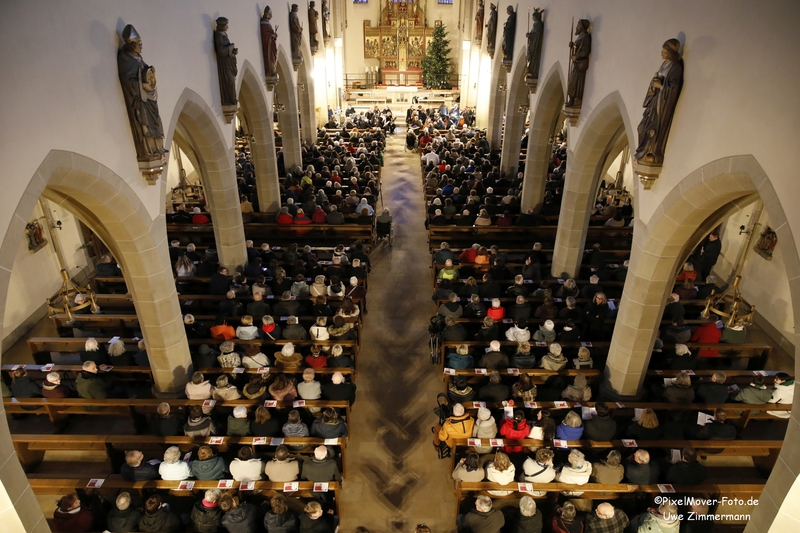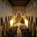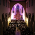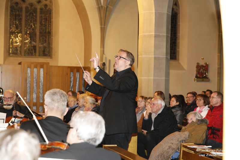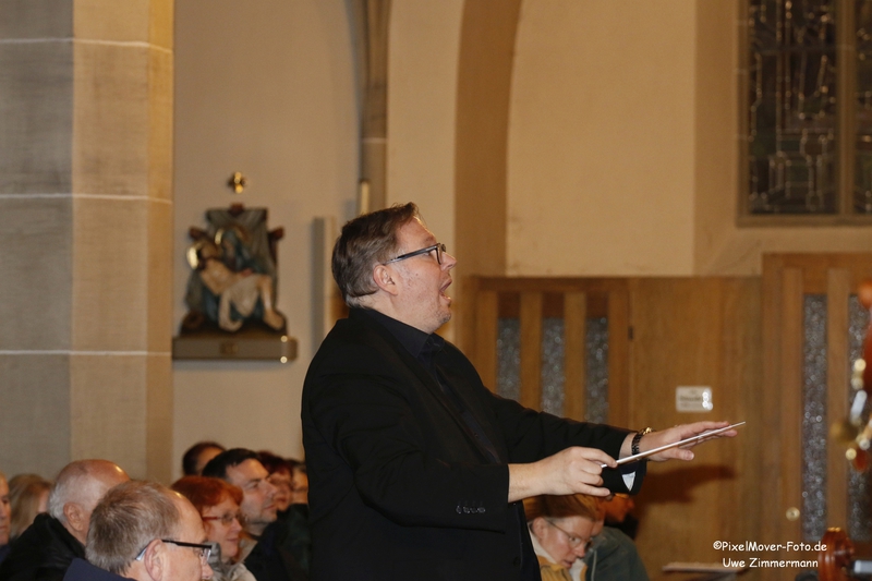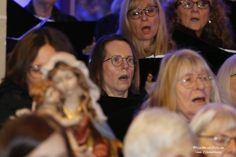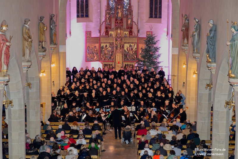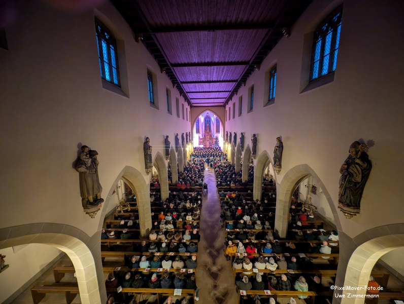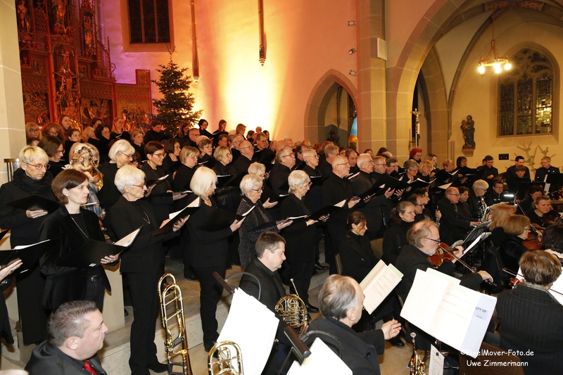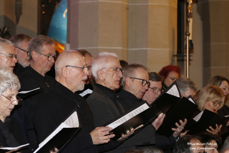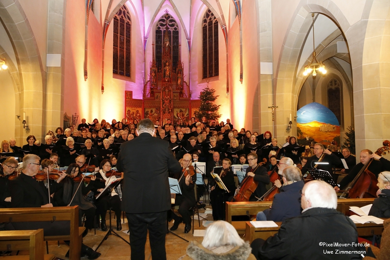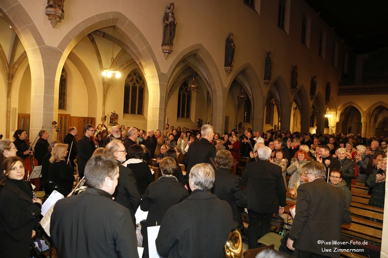 In der vollbesetzten Kirche in Hambrücken boten die Sängerinnen und Sänger ein stilistisch abwechslungsreiches Programm der Superlative, das seinesgleichen sucht. Allein die beiden namensgebenden Komponisten John Rutter und Karl Jenkins versprachen allein schon einen Abend voller Emotionen und eingehender Melodien. Der aus gut 100 Sängerinnen und Sängern bestehende Gesamtchor füllte den Altarraum der Pfarrkirche St. Remigius komplett aus. Hinzu kamen die knapp 40berufenen Musiker der Kurpfalzphilharmonie Heidelberg und eine feierliche und stimmungsvolle Illumination der Pfarrkirche St. Remigius Hambrücken, wodurch dieser Konzertabend zu einem Klang- und Augenschmaus für die zahlreichen Zuhörer wurde.