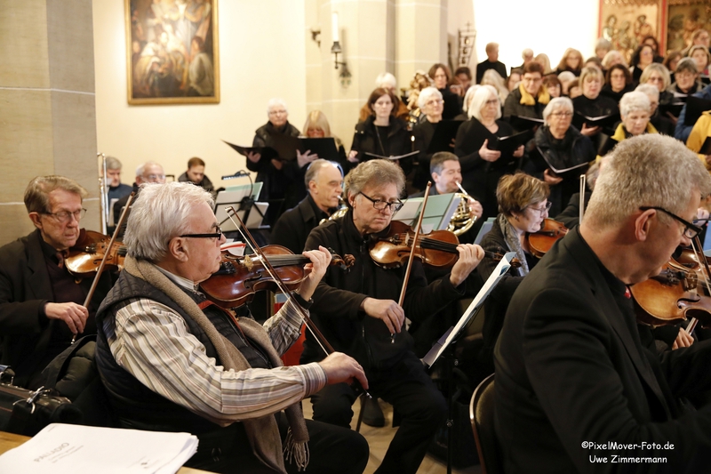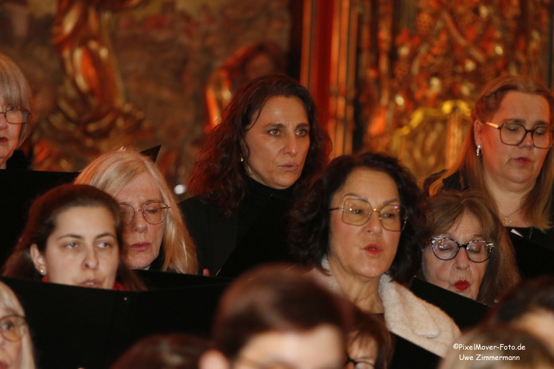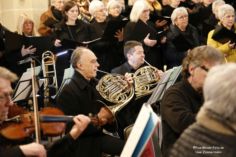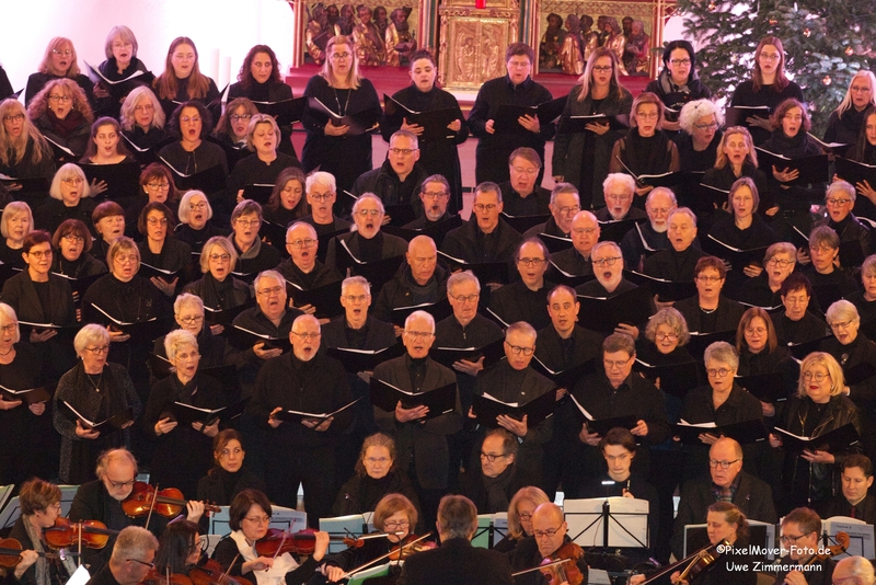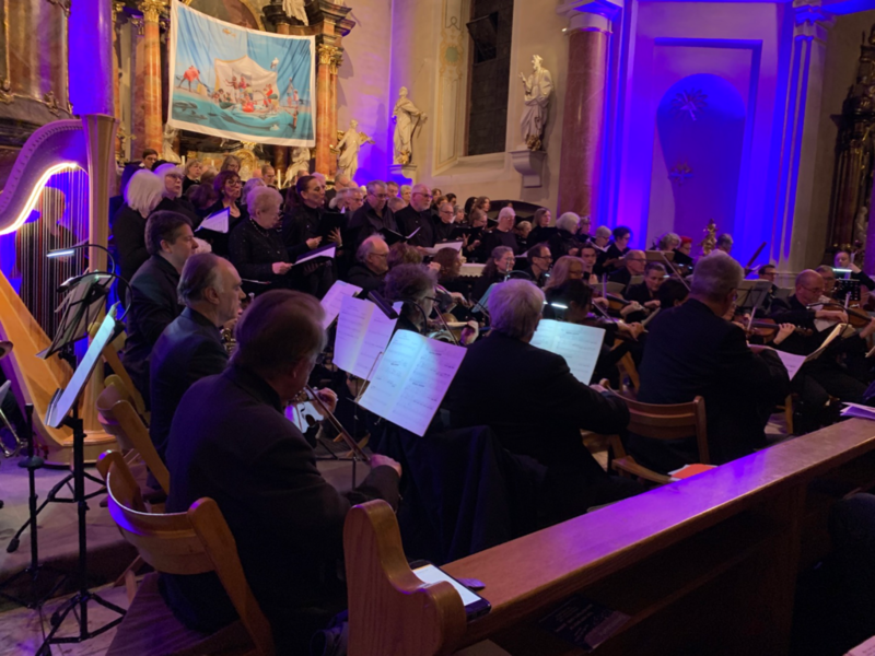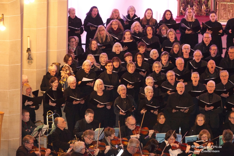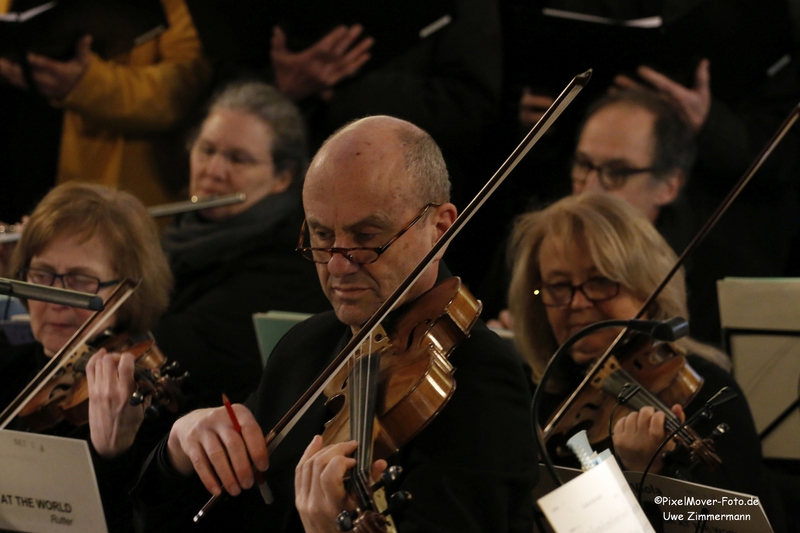 Die bestens vorbereiteten Sängerinnen und Sänger sowie die Musiker boten ein stimm- und klanggewaltiges gewaltiges Programm dar. So erklangen u.a. von John Rutter „Schau auf die Welt“, „Für die Schönheit dieser Welt“ und das „A Clare Benediction“. Von Karl Jenkins waren unter anderem „Adiemus“, „The Peacemakers“, „Stabat Mater“ und „The Armed Man“ zu hören.